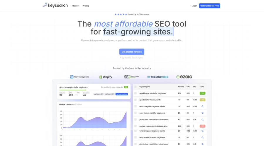 For less than 20% of the price, KeySearch offers 70% of the capability of a premium all-in-one solution. The software employs proprietary algorithms for keyword analytics and the Moz API for backlink data.